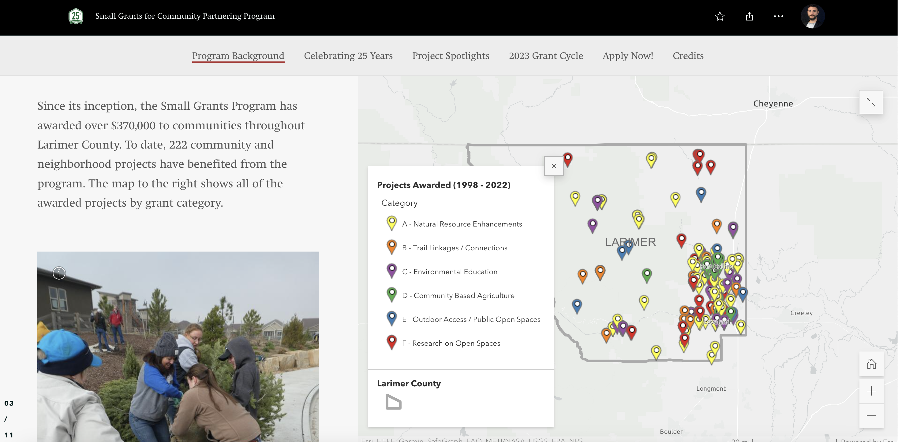 In the summer of 2022, the Geospatial Centroid at CSU hired me as an intern to work on a StoryMap project for the Larimer County Department of Natural Resources. I reviewed data from 1998 to 2022 and identified specific locations of projects that were awarded the County’s Small Grant for Community Partnering Program. After geolocating each of the awardees, I used ArcGIS StoryMap to create a place-based narrative about the twenty-five-year history of the program, and the different grant categories each project fell into ( check out the full version of the storymap here).